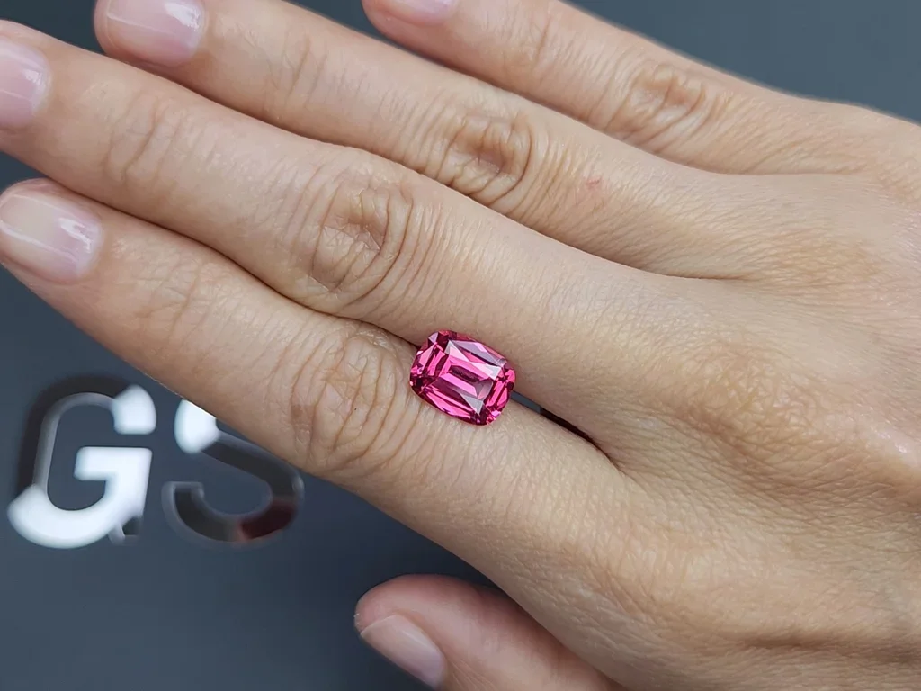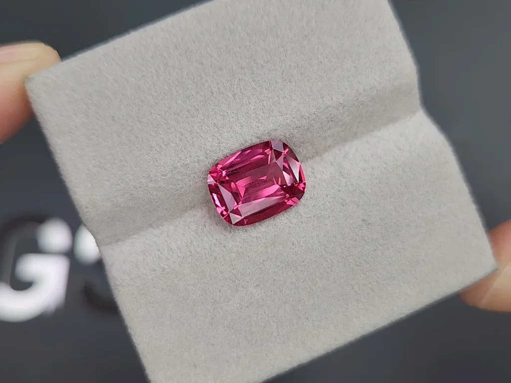 This magnificent 3.26-carat cushion-cut Mahenge spinel showcases the intense vibrant pink coloration that has made Tanzanian spinels world-renowned. The stone displays strong fluorescence, enhancing its visual appeal with exceptional brilliance.