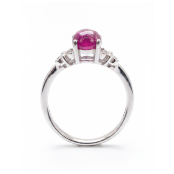 Feature Description Metal Type 925 Sterling Silver (High Polish) Center Stone Round Cabochon-cut Ruby (Deep Pinkish-Red) Stone Texture Unfaceted surface with natural inclusions Side Detail Intricate floral/leaf motif with openwork filigree Accent Stones Small, round clear stones set within the shoulder design Setting Style 4-Prong setting with vintage-style shoulders Style Profile Boho-chic, Art Nouveau, Romantic, and Vintage -