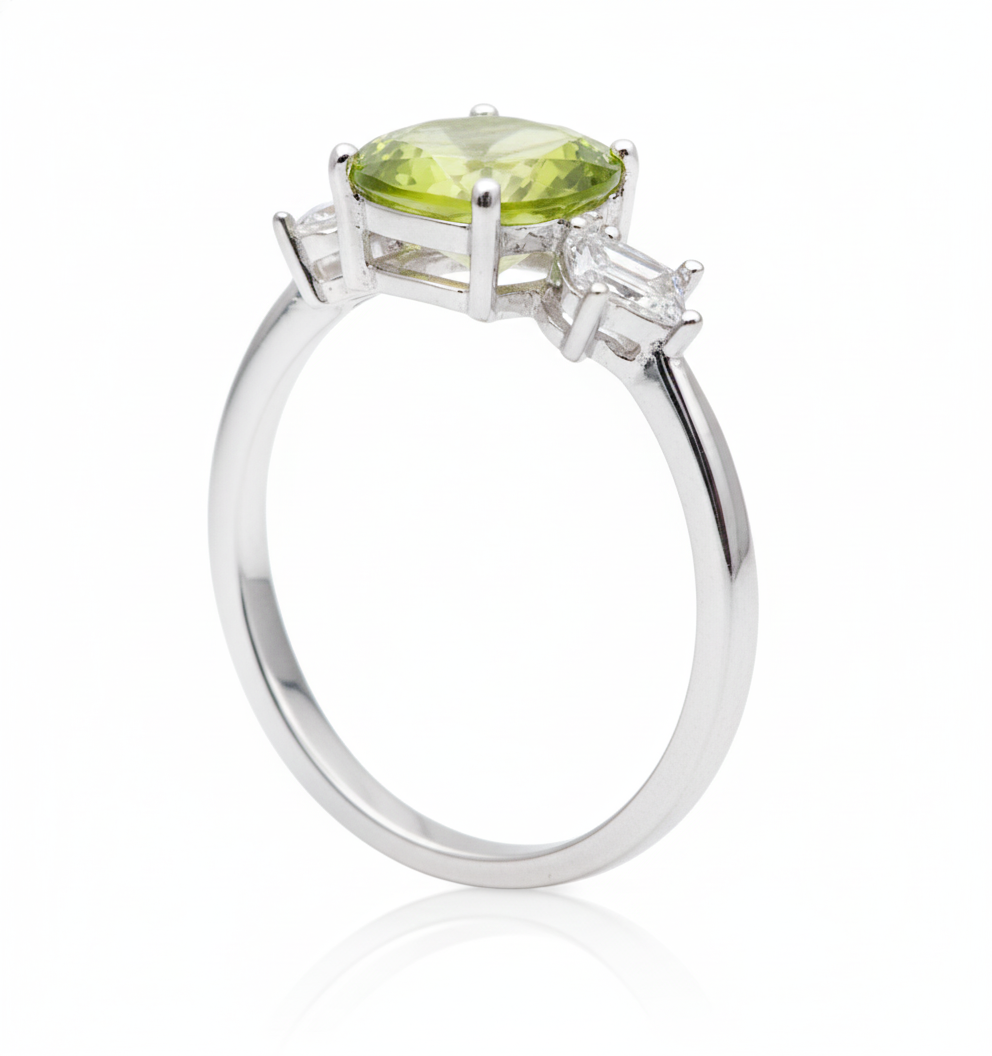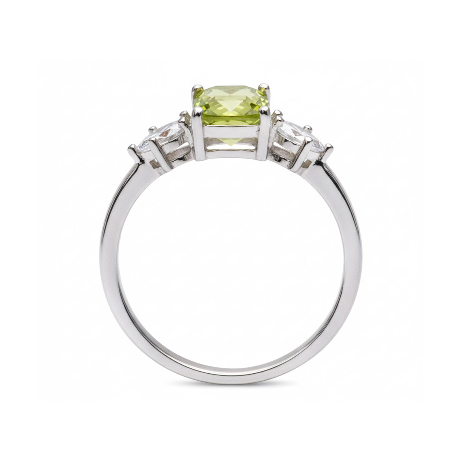 Bring a pop of natural color to your jewelry collection with this stunning peridot ring. At the heart of the design sits a crisp, rectangular emerald-cut peridot, known as the “gem of the sun” for its joyful green glow. Flanked by sparkling clusters of marquise-cut stones that mimic delicate petals, this ring offers a timeless look with a contemporary twist. Set in high-shine sterling silver, it is the perfect gift for August birthdays or anyone who loves the refreshing beauty of green gemstones.
