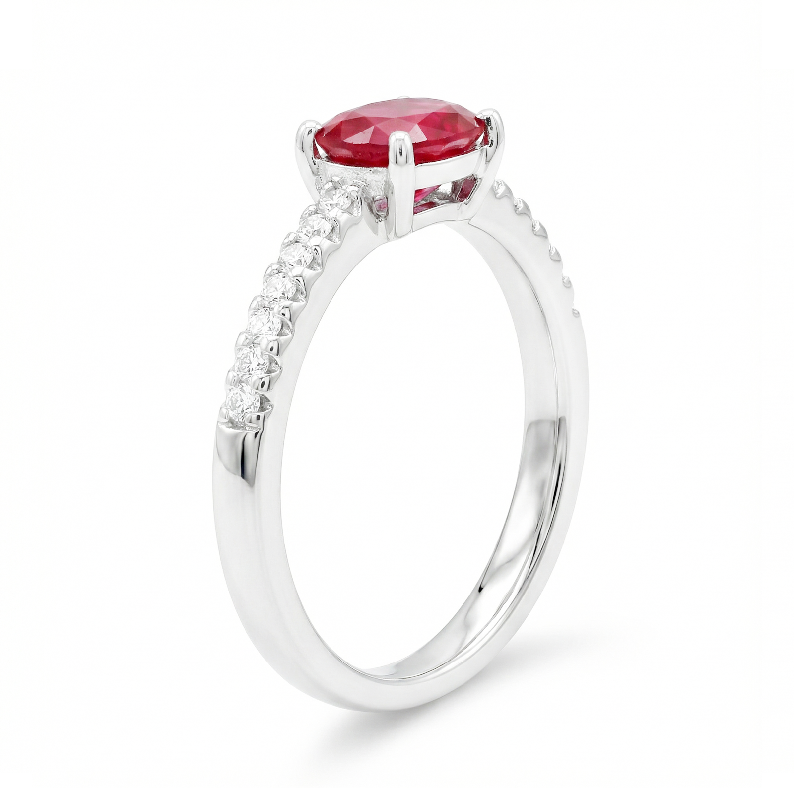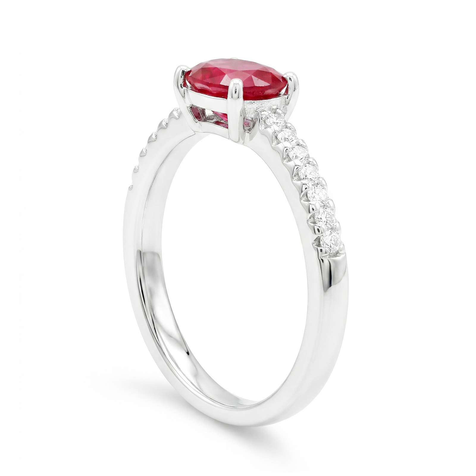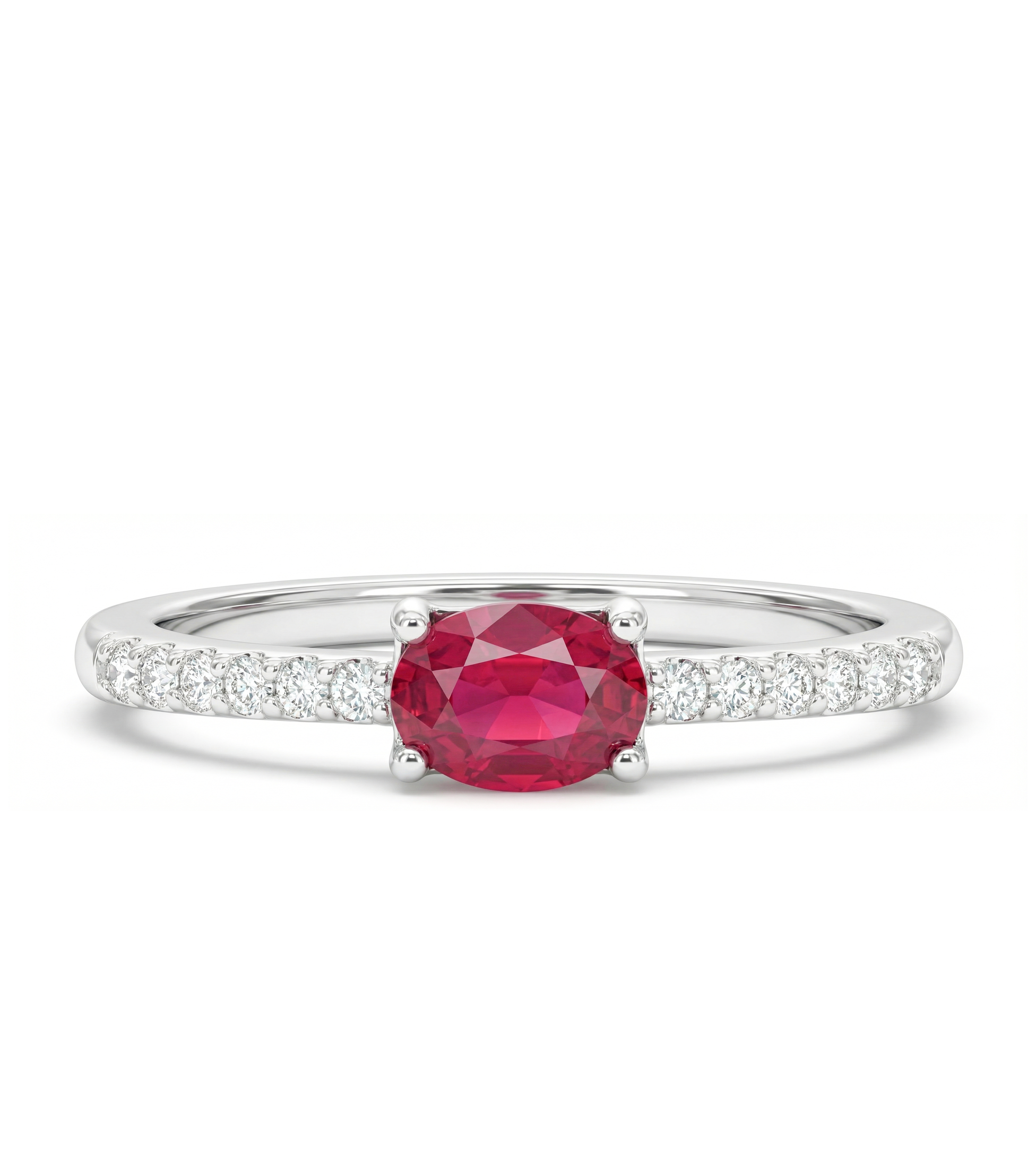 • Center Stone: Oval-faceted Ruby with deep red color.