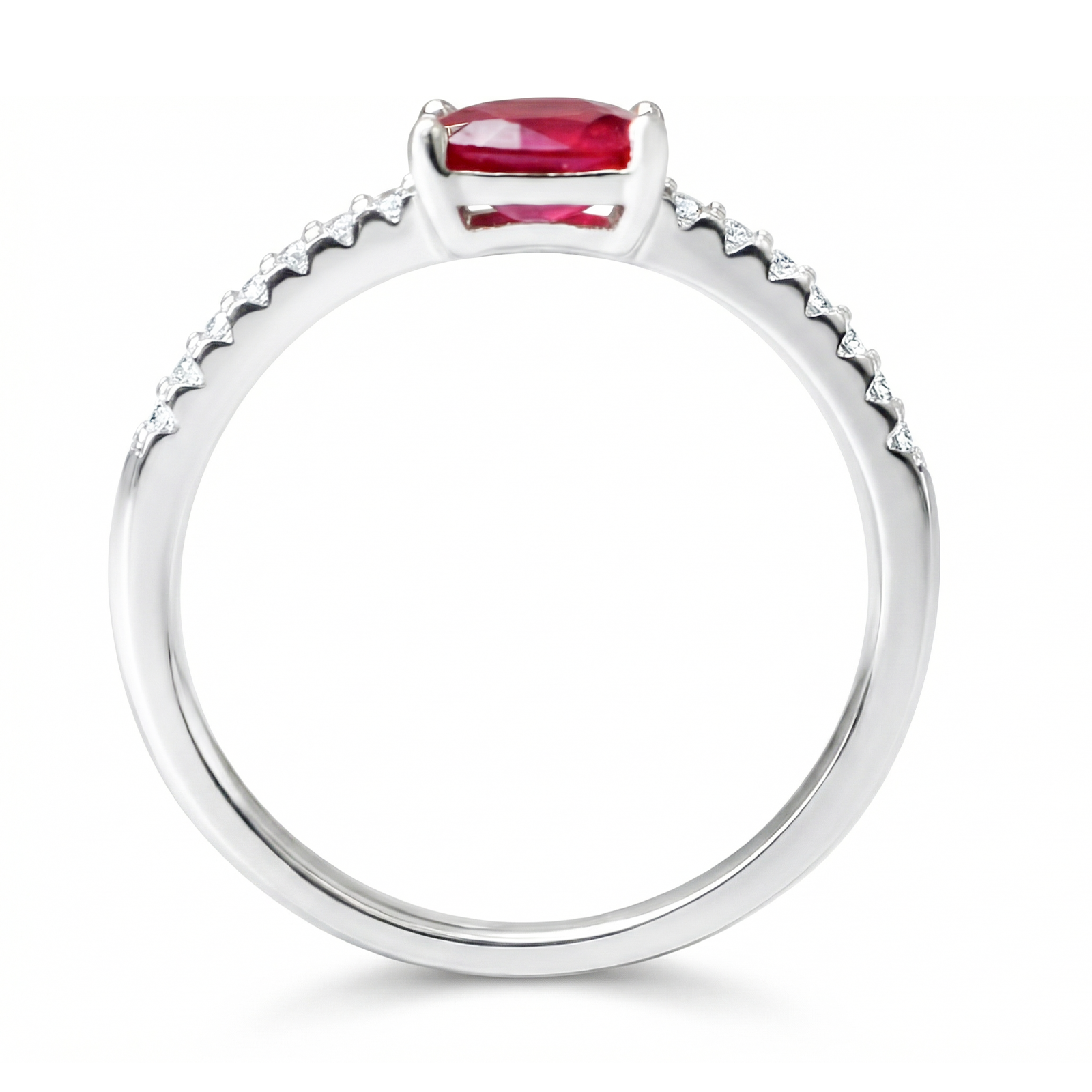 The lustrous silver band is delicately paved with a row of sparkling clear accent stones on either side of the centerpiece. These dazzling accents draw the eye inward, creating a perfect frame for the ruby and adding a touch of glamour to the slender profile.