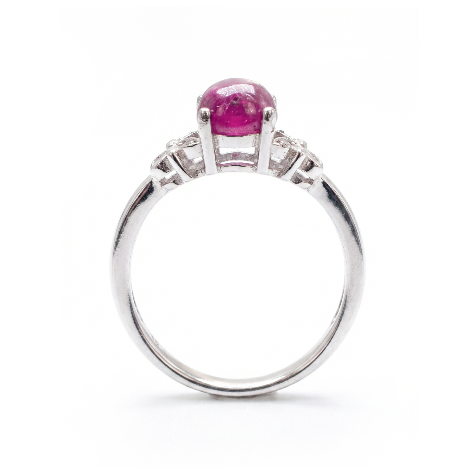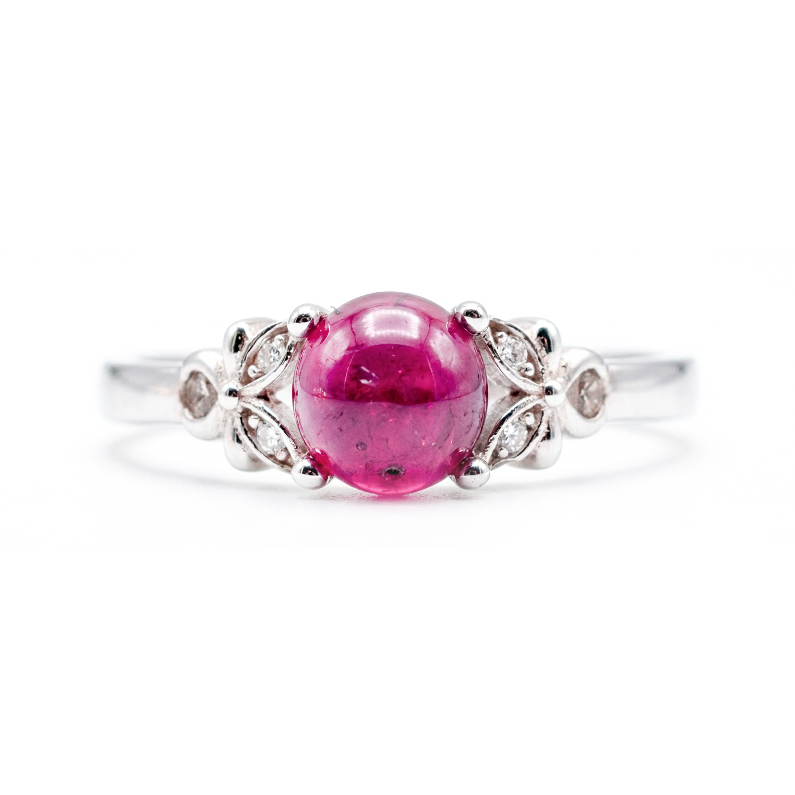 Designed for the romantic at heart, this captivating piece features a stunning cabochon-cut ruby at its center. Unlike modern faceted cuts, the domed surface of this gemstone highlights the ruby’s natural, deep raspberry-red hues and unique internal characteristics, giving it a soft, glowing, and organic beauty reminiscent of antique jewelry.